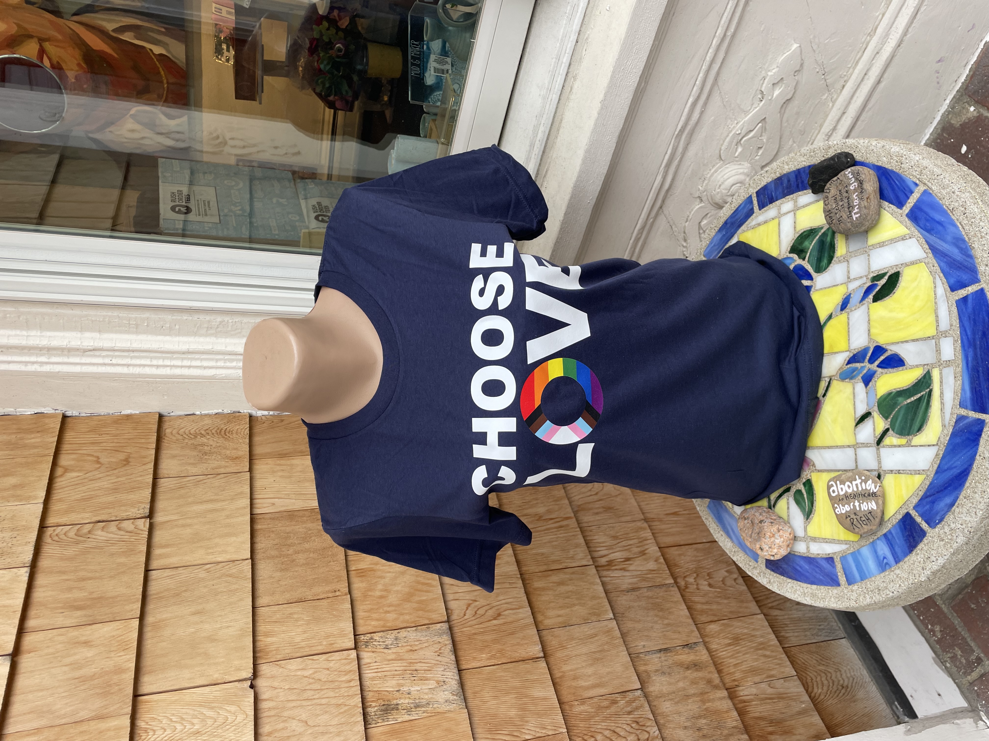 Designed by artist Jo Hay, this navy blue, unisex, crew neck t-shirt states "Choose Love" in bold white type with a pride flag in the O of love.